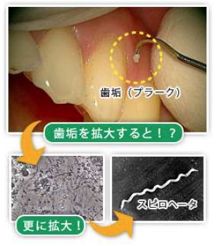 歯や、歯と歯の隙間(歯周ポケット)などに付着したプラーク(歯垢)を確認した上で、それを一部採取して位相差顕微鏡を用いて、細菌の活動性をみる簡易検査を行います。